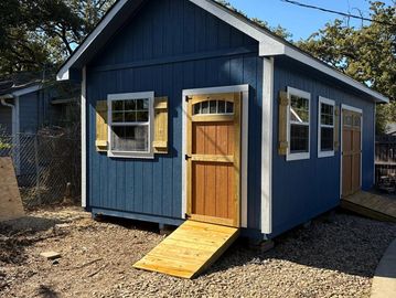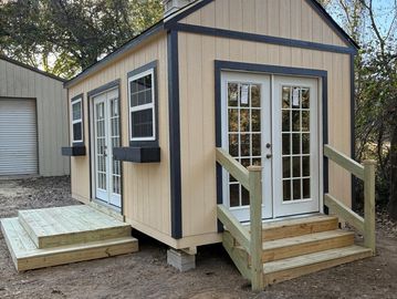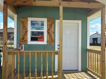 This 10x18 Bungalow was built in Kaufman, Texas (75142). This comes with (2) sets of French doors, a cupola, (2) 36x36 windows, 8/12 roof pitch, (2) flower boxes, 6x8 deck and railings.
