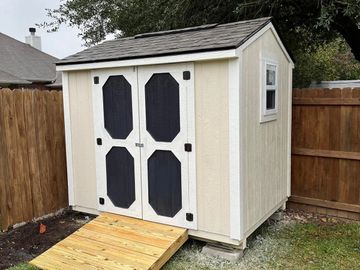 Tight on space? You'll love our skinny mini sheds, just enough space to store your outdoor gardening tools and lawnmowers. This 6x8 was built on site, in one day, in Fort Worth (76140). This includes the double barn doors, two windows, ramp, ridge vent, and paint color of your choice.